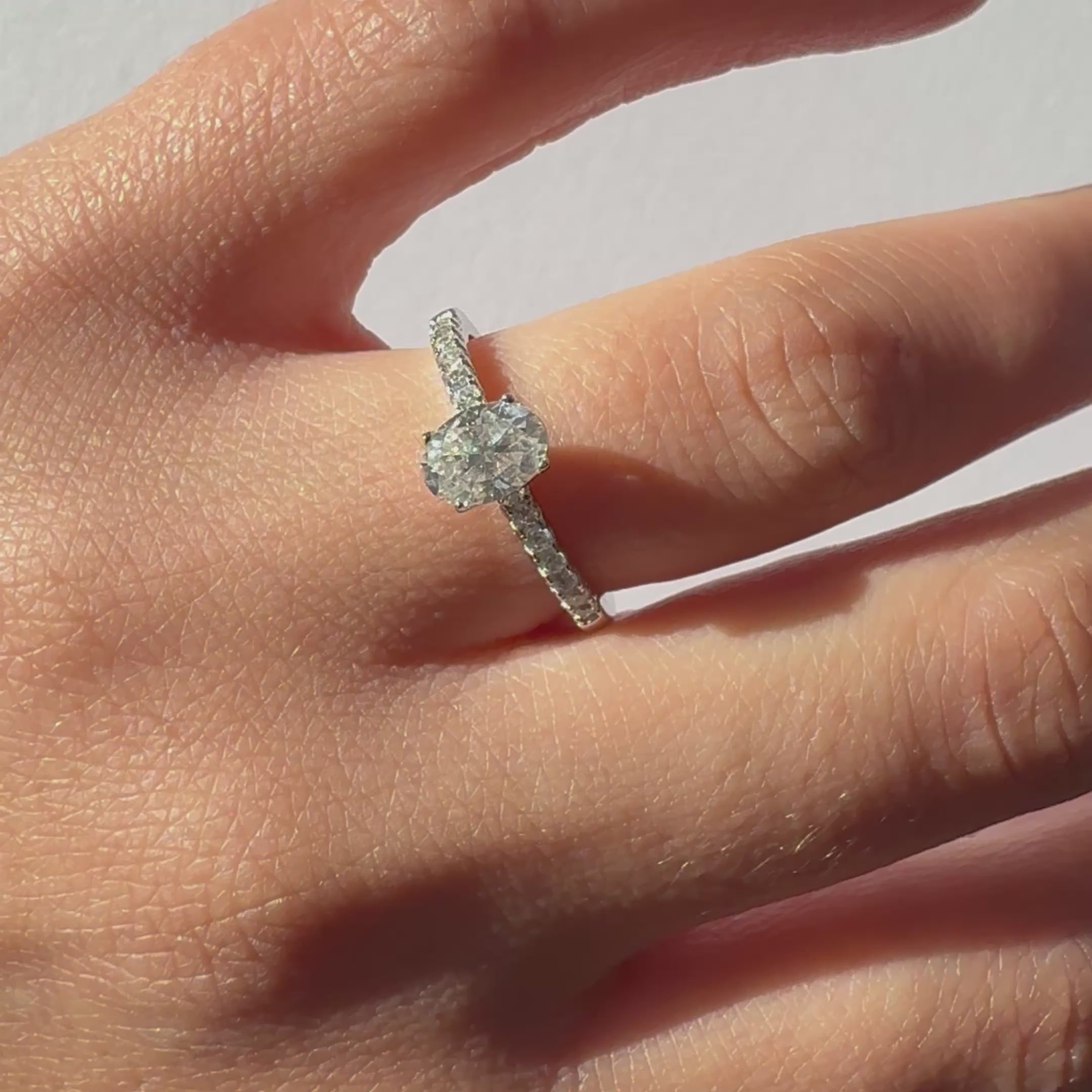 Sa moissanite taille ovale de 1 carat capte la lumière avec une intensité naturelle, révélant une brillance à la fois tendre et majestueuse.